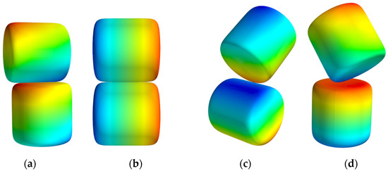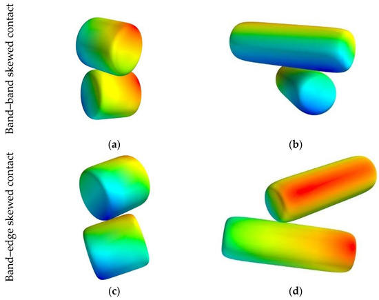 Figure 18. Comparative visualization of cylinder pairs with (a) band–band skewed contact, AR = 1.0; (b) band–band skewed contact, AR = 3.0; (c) band–edge contact, AR = 1.0; (d) band–edge contact, AR = 3.0.