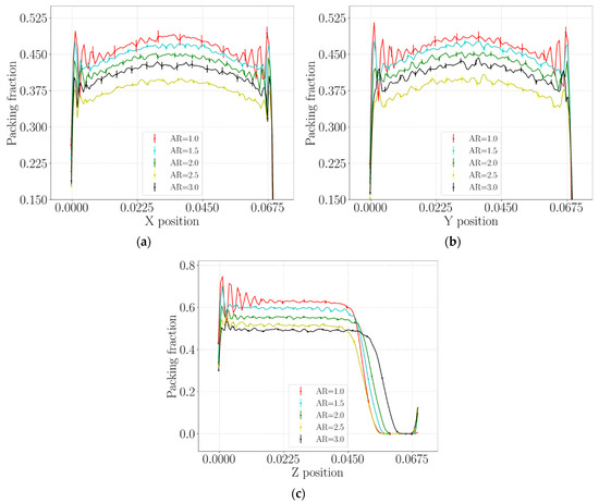 Figure 12. Variation of local packing fraction in (a) x, (b) y, and (c) z planes.