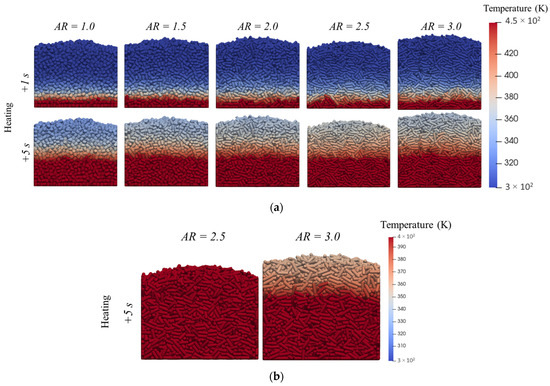 Figure 13. Temperature distribution in packed beds of (a) cylinders with all ARs in temperature range from 300 K to 450 K and (b) cylinders with AR = 2.5 and AR = 3.0 in temperature range from 300 K to 400 K.