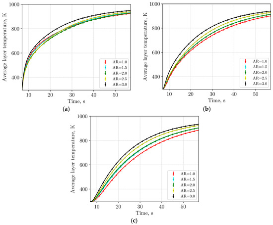 Figure 14. Temporal evolution of average layer temperature for cylindrical particles with various ARs: (a) layer 1, (b) layer 2, and (c) layer 3.