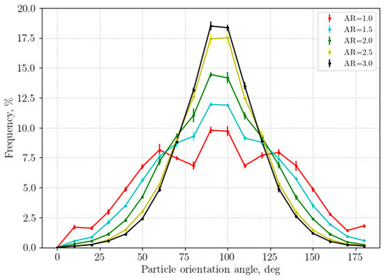 Figure 15. Distribution of orientation angles for cylindrical particles with various ARs.