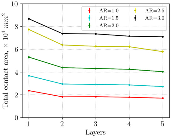 Figure 16. Total contact area in each layer for compacts of cylindrical particles with various ARs.
