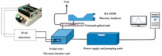 Mercury Adsorption: A 400 mg/L mercury [Hg (II)] working solution was prepared from Hg(NO3)2·H2O. The total mercury concentration in the biochar was determined according to ASTM method D6722-11 [], using an analytical complex consisting of an RA-915M atomic absorption spectrometer and a PYRO 915+ pyrolytic (Lumex Ltd., St. Petersburg, Russia). In the process, 0.5 g of the biochar was added to 50 mL of mercury solutions in a polypropylene tube. The mixture was placed on a vibrating shaker (Heidolph, Schwabach, Germany) at a speed of 200 rpm. A 20 mL adsorbate solution was taken every 15 min, soaked onto carbon material, and inserted into the PYRO-915+ furnace to measure Hg (II) amount (Figure 2).
