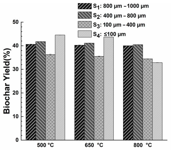 Effect of different SS particle sizes on the biochar yield (%) at different pyrolysis temperatures. Standard deviations were all less than ±0.5%.