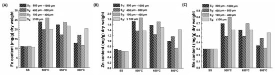 Total amount of Fe (A), Zn (B), and Mn (C) in the different particle sizes of sewage sludge at 500, 650, and 800 °C.