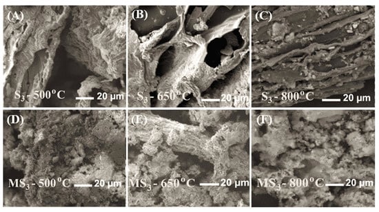 A crucial parameter of an adsorbent material is its surface morphology, which highlights its porous structures. Among all samples, the SEM analysis was performed only for the S3-sized fraction of the biochar for brevity, as they showed better adsorption characteristics. Figure 5A–C show the SEM images of biochar (S3; top), and Figure 5D–F shows an alkali-modified biochar (MS3; bottom) surface at 500, 650, and 800 °C. The pictures highlight that fractures on the surface increased with pyrolysis temperature from 500 to 650 °C and that the hole sizes and distribution increased. However, an increase in temperature to 800 °C led to a decrease in the number of surface holes, as seen in Figure 5C,F. After modification of sewage sludge–derived biochar by NaOH, rough granular structures were observed, as seen in the bottom panel of Figure 5. However, modified biochar at 800 °C also showed much less porous structures.