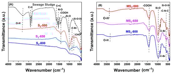 Structural characterization of sewage sludge, (A) sludge-derived biochar (S3), and (B) modified sludge–derived biochar (MS3) for S3-sized particles at 500, 650, and 800 °C.