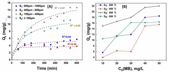 The MB absorption was first performed on various particle sizes (S1, S2, S3, and S4) to investigate the adsorption mechanism at low concentrations of the contaminants. As shown in Figure 7A, the experiment employed biochar samples without pretreatment to assess the inherent behavior of each size fraction produced at a pyrolysis temperature of 500 °C. The results revealed an exciting interplay between biochar particle size and MB adsorption from a solution of 10 mg/L of MB. The adsorption kinetics was followed for 600 min, wherein all the four sizes of particles reached equilibrium capacity, characterized by a constant MB concentration of 10 mg/L. Intuitively, smaller particle sizes should have had the highest adsorption capacity due to the larger surface area. However, our results revealed that the biochar particle of size S3, (100–400 μm) demonstrated the highest adsorption capacity, reaching 14.6 mg/g. In contrast, the smaller-sized biochar particle S4 (<100 μm) and larger-sized particles S1 (800–1000 μm) and S2 (400–800 μm) had a low adsorption capacity of 11 mg/g, 5.5 mg/g, and 3.5 mg/g, respectively. The excellent performance of the particle size of sludge-derived biochar (S3) can be attributed to more active sites, as observed from the ICP analysis. The standard deviation was within ±0.2%.