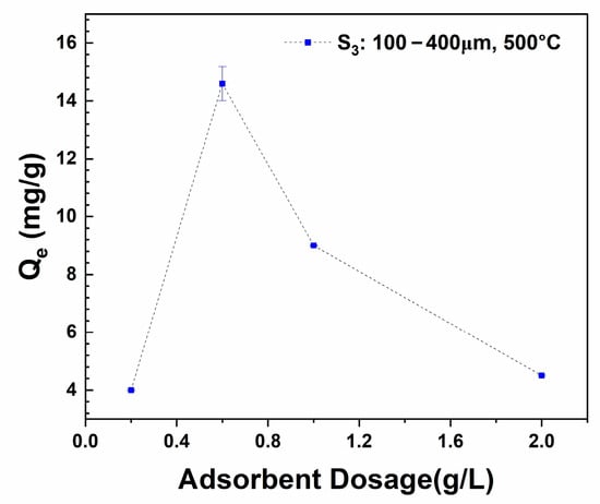 The effect of adsorbent (S3: 100–400 µm) dosage was studied using 10 mg/L of methylene blue and varied adsorbent masses of 0.01 g, 0.03 g, 0.05 g, and 0.1 g. The equilibrium adsorption capacity of methylene blue onto the sewage sludge–derived biochar increased with increasing adsorbent mass from 0.2 g/L to 0.6 g/L (Figure 8); however, it decreased in equilibrium adsorption capacity with a continual mass dose from 0.6 g/L to 2 g/L and approximately 95% removal efficiency. Hence, the results suggest that 0. 6 g/L is an optimal adsorbent mass required to effectively remove 10 mg/L of methylene blue from aqueous water.
