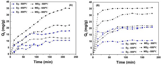 The study also investigated the impact of pyrolysis temperatures (500, 650, and 800 °C) and alkali activation on particle size fraction (S3: 100–400 µm) adsorption for individually removing 400 mg/L of methylene blue and mercury from an aqueous solution with an adsorbent mass of 500 mg. The sampling interval was 15 min at an agitation speed of 200 rev/min, following a consistent experimental procedure for methylene blue and mercury removal studies. Figure 9 shows the adsorption capacity of methylene blue (Figure 9A) and mercury (Figure 9B) with time. The modified biochar MS3-650 °C exhibited the highest adsorption capacity for methylene blue at 35 mg/g and mercury at 36 mg/g, potentially attributed to its elevated surface area of 144.27 m2/g (Table 1). Despite modified biochar MS3-800 °C possessing a surface area of 27.78 m2/g, in comparison to sewage sludge biochar S3-500 °C of 26.38 m2/g, the adsorption capacity of methylene blue onto S3-500 °C (15 mg/g) exceeded that of MS3-800 °C (10 mg/g). This disparity was associated with larger pore diameter of 5.81 nm of S3-500 °C as compared to 1.90 nm of MS3-800 °C, indicating that the total pore diameter of the biochar influenced the quantity of methylene blue molecules to be adsorbed. Further, the removal of the O-H group from the surface of the biochar at temperatures of 650 °C and 800 °C led to a decrease in methylene blue and mercury adsorption capacity of S3-650 °C and S3-800 °C, consistent with the findings of []. From Figure 9B, the modified biochars (MS3-500 °C, MS3-650 °C, MS3-800 °C) showed superior mercury adsorption capacity than sewage sludge–derived biochars (S3-500 °C, S3-650 °C, S3-800 °C), with surface area being the predominant factor.
