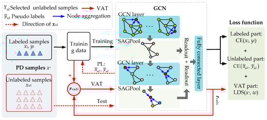 As shown in Figure 3, xl and xul represent the labeled and unlabeled PD samples, respectively. The semi-supervised approach initially employs xl to train the GCN model. After each iteration, the unlabeled xul are tested, and those with a confidence level b > 0.7 () are marked pseudo-labels , which dynamically enlarge the training set for the next iteration. During training, the VAT seeks to identify the maximum perturbation boundary for each sample in order to enhance the robustness of GCN. Its principle will be introduced.