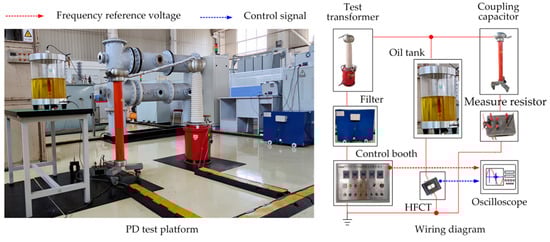 This section follows the standard IEC60270:2000 [23] to establish a PD test platform, as shown in Figure 5. The experiment uses a high-frequency current transformer (HFCT) to detect PD signals within a detection band of 1–35 MHz. The signals are recorded on an oscilloscope with a bandwidth range of 1 to 10 MHz and a sampling rate of 20 MS/s.