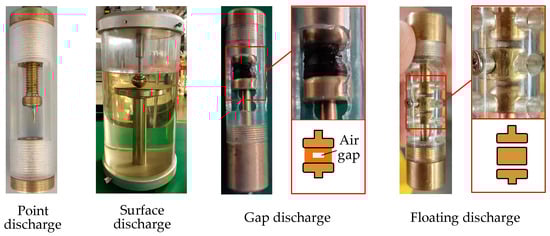 Four fault models have been developed to simulate PD faults in power transformers, such as point discharge, surface discharge, gap discharge, and floating discharge. These models, illustrated in Figure 6, are constructed using various electrodes: a needle-plate electrode, a ball-plate electrode containing insulating paper (to simulate discharge along the insulating surface), a plate-to-plate electrode with an air gap in the middle (to simulate bubble discharge in oil), and another plate-to-plate electrode with a suspended copper block (to simulate potential-induced discharge). Each model is submerged in mineral oil during the experiment.