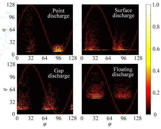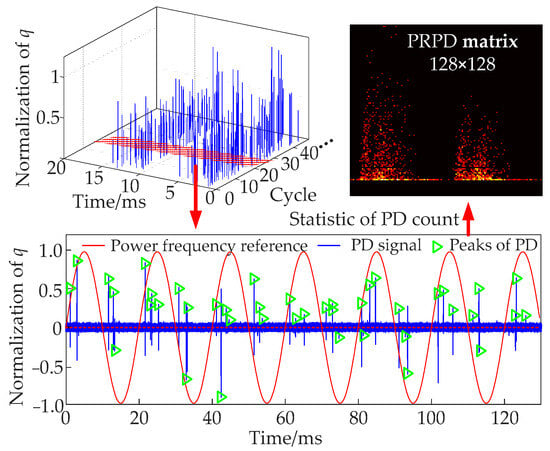 A PRPD spectrum is produced through collecting time-domain signals at 2 s intervals (100 cycles). The initial step involves converting the moments of PD pulses into phases ranging from 0° to 360°. To optimize the computational efficiency of GCN, the discharge phase and quantity (0~qmax) are evenly divided into 128 intervals each, resulting in a 128 × 128 matrix. The values in the matrix denote the statistics of PD within specific phase and quantity intervals. These values undergo linear normalization using the ‘max-min value’ approach. The diagram of preprocessing is shown in Figure 7.