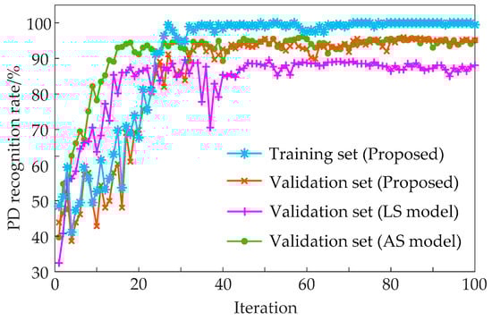 Figure 10 displays the iteration curves. The FS model demonstrates a PD recognition rate of approximately 90%, while the AS model achieves around 96%. Through successive iterations, the proposed model consistently converges towards the recognition rate of the AS model. These findings indicate that the proposed model has the capability to extract features from unlabeled PD samples, consequently enhancing its performance in comparison to the LS model, which disregards unlabeled samples.