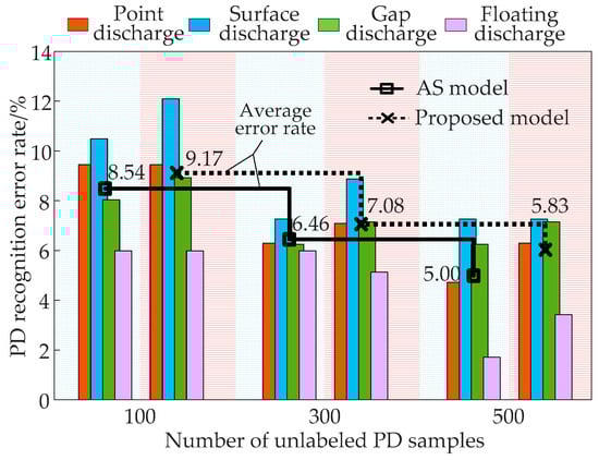We maintained the number of labeled samples while varying the number of unlabeled samples to 100, 300, and 500 in order to further compare the proposed approach with the AS model. This means the AS model incorporates the labels of unlabeled samples into the supervised training process. The outcomes are shown in Figure 11. As the number of unlabeled PD samples increases, the average error rates for the four types of PD faults gradually decrease to 9.17%, 7.08%, and 5.83%. This trend exhibits a resemblance to the performance of the AS model when utilizing all available samples and their labels.