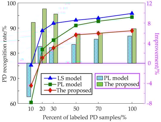 The control groups of the ablation experiment consist of the LS model and the PL model. The experiment utilizes 600 unlabeled samples, 100 labeled validation samples, and 480 test samples. These samples are used to create a new training set by randomly adding 10%, 20%, 30%, 50%, 70%, and 100% of the labeled training data. The recognition rates of these approaches are depicted in Figure 12, where the line chart shows the PD recognition rate, and the bar chart demonstrates the improvement compared to the LS model.
