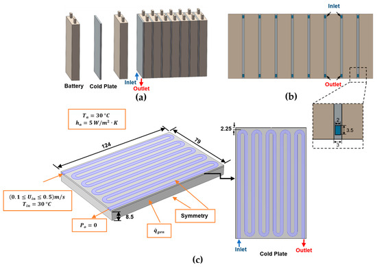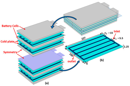 Figure 2. The proposed schematics of the BTMS: (a) internal configuration of the battery module; (b) half of the domain of a single minichannel cold plate (units: mm).