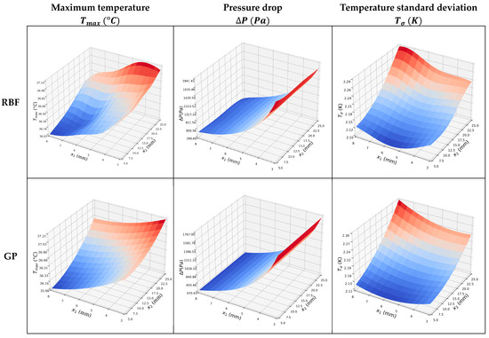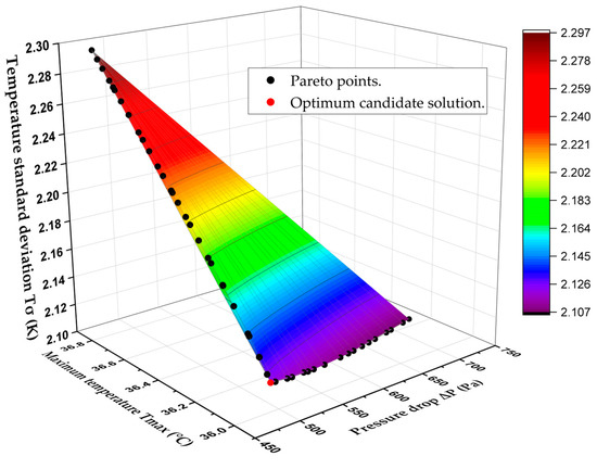 Finally, Figure 12 displays the 3D Pareto-optimal surface that is used to analyze trade-offs between the three competing objectives, T σ , P , and T m a x . The 3D Pareto-optimal surface’s accuracy is again verified by comparing a subset of the optimal points with corresponding CFD predictions, as shown in Table 13. The candidate point is chosen from among all non-dominated solutions and is located in the lower left corner of the pareto-optimal surface (See Figure 12). Table 14 shows a comparison between the optimum candidate design and the original (Benchmark) design of the BTMS. It also shows the performance enhancement, with the maximum temperature decreasing from 36.38 to 35.99 °C, the pressure drop dropping significantly from 782.82 to 494.41 Pa, and the temperature standard deviation reducing from 2.14 to 2.12 K.