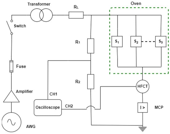 The circuit, depicted in Figure 1, was specifically designed to supply voltage to the tested specimens placed inside an oven and to measure the partial discharges: