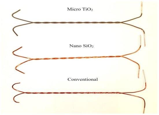 The twisted-pair specimens shown in Figure 3 consist of enameled grade 2 copper wires with a 1.12 mm diameter, and all belong to the thermal class of 200. The enamel composition is as follows: