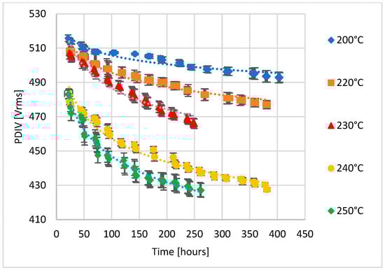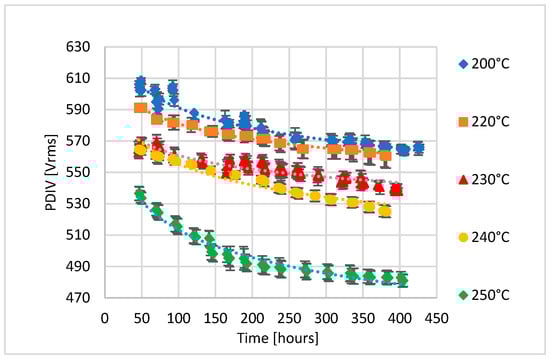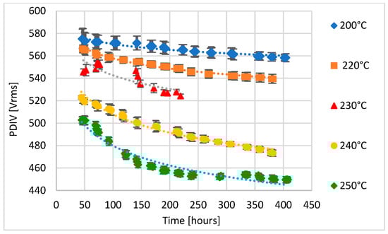 The obtained PDIV values are summarized in the following plots. Each reported point is computed as the average of the results obtained for the three samples of each material and test condition. Figure 4, Figure 5 and Figure 6 illustrate the temporal evolution of the average PDIV for three types of enamel: Conventional enamel, enamel micro-filled with TiO2 particles, and enamel nano-filled with SiO2 particles, respectively.