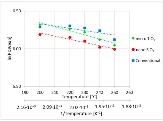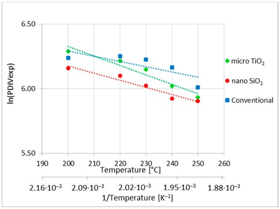The PDIVexp values pertaining to the micro-filled TiO2 and nano-filled SiO2 enamels are well-fitted using the relationship in Equation (2). By contrast, the Conventional enamel does not exhibit Arrhenius behavior, as it shows an increase at 220 °C compared to 200 °C, followed by a decrease, deviating from a linear trend. Nevertheless, at the thermal class temperature, the micro-filled TiO2 enamel shows the best behavior, but the Conventional enamel has the highest PDIVexp values when the temperature increases, as shown in the Figure 8 and Figure 9. It is necessary to remember that in the presence of partial discharges, the Conventional enamel has a much shorter lifetime than the micro- and nano-filled enamels [27,28].