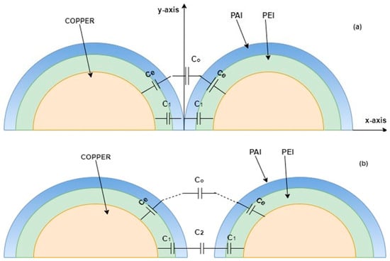 To better interpret the obtained results, DC capacitance measurements were conducted at ambient temperature on three parallel-connected samples for each material and aging temperature, following the aging process. For reference, the capacitance of three unaged twisted pairs connected in parallel were also measured. Table 7 shows the obtained results, which demonstrate that the Conventional enamel has the lowest capacitance and the nano-filled SiO2 enamel has the highest capacitance. This is consistent with the obtained PDIV values, since the highest PDIV values correspond to the highest capacitance and the lowest PDIV values correspond to the lowest capacitance value. In fact, as shown in Figure 10a,b, the electric field in the discharge area depends mainly on the ratio Ce/Co (Figure 10a) or C1/C2 (Figure 10b) as well as on the distance between the two wires. With the increase in the y value, Co decreases, and the corresponding electric field also decreases [29]. Therefore, the higher the Ce or C1 value, the higher the electric field in air and the lower the PDIV value. The higher capacitance values of micro-filled TiO2 enamel and nano-filled SiO2 enamel compared to the Conventional enamel depends on the nature of the two fillers and on the material structure.