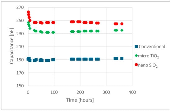 To clarify the behavior of the enamels studied here, the DC capacitance of 15 twisted pairs connected in parallel was measured over time during aging at 230 °C. The obtained DC capacitance values are graphed in Figure 11. For the nano-filled SiO2 enamel and the micro-filled TiO2 enamel, there was an initial rapid decrease in capacitance, probably due to the presence of inorganic fillers, which results in a different surface behavior compared to Conventional enamel. Additionally, the initial decrease in capacitance may be attributed to the release of absorbed moisture.