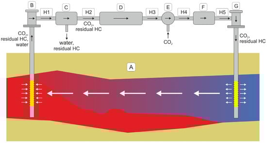 This work aimed to carry out simulation forecasts of the complete geothermal energy generation process, covering all the elements of the system designed for the implementation of this process. The system included a realistic, depleted hydrocarbon reservoir, existing producing and injecting wells, and surface installation elements, including pipelines, separators, and heat exchangers. Simulations were carried out for a selected, domestic gas field. It should be emphasized that the simulations are coupled and dynamic, taking into account the interdependence of the individual system elements operating in a cyclical fluid flow system transporting geothermal energy from the reservoir through producing wells, surface installation, and injecting wells back into the reservoir, taking into account continuous changes in temperature, pressure, and the composition of circulating fluids. The system of geothermal energy recovery from a hydrocarbon reservoir consists of several elements, presented schematically in Figure 1 and described below, where the capital letters A, B, …, and H5 refer to the elements presented in the figure.