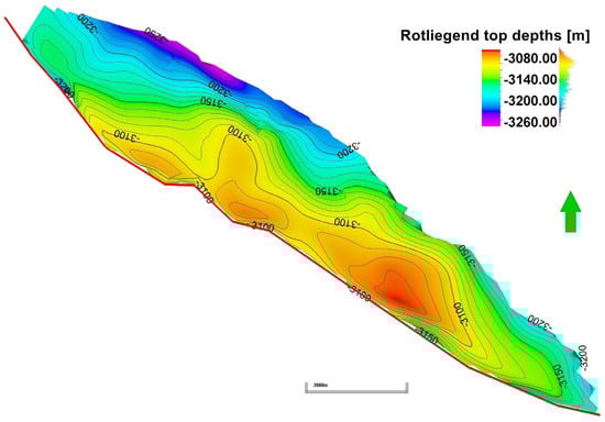 Structural map of the top of the Rotliegend formation for the selected gas field after [25]. The red line represents the intersection of the main sealing fault with the top surface of the Rotliegend formation.