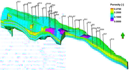 3D grid of the reservoir simulation model with the distribution of the porosity in the selected gas field after [15]. The southwest part of the model is cut out to display the internal structure of the gas-bearing zone.