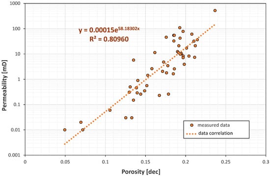 The absolute horizontal permeability model was determined by finding a firm relationship between the core lab porosity and the measured permeability (adjustment coefficient, R2 = 0.8096). The most representative relationship is presented in Figure 4, based on data from the well R-2-calibrated to well-test results.