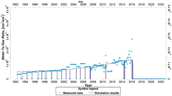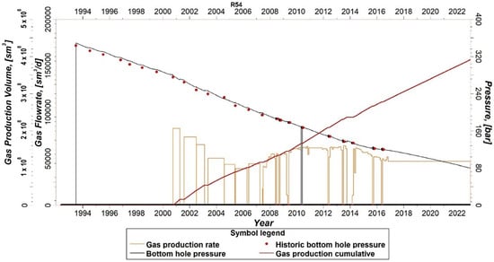 The quality of the data match was satisfactory. The pressure match was characterized by the general fitting error of 2–5 bar. An average reservoir pressure drop of about 160 bar was noted, from 352 bar to 194 bar, from 1992 to 2007. In the next 15 years, the average reservoir pressure decreased to 71 bar. To obtain this pressure match, the partial local barriers were introduced in the central part of the reservoir to properly reproduce the hydrodynamic communication between the producing wells. Modifications of the transport properties within implemented LGR regions contributed to correctly reproducing the water-to-gas ratios in the producing wells. The observed increasing average reservoir water-to-gas ratio from 3.0 × 10−6 sm3/sm3 (in 1992), through 5.0 × 10−5 sm3/sm3 (in 2007), up to about 1.0 × 10−4 sm3/sm3 (in 2022), indicated an upward trend of formation water activity. The pore volume occupied by water increased by 0.8 × 106 rm3, through the production history of the reservoir. The total water influx from the aquifer into the reservoir of 5.2 × 106 sm3 was observed at the end of the production period. An example of the calibration procedure for the selected well of R-54 in terms of the bottom-hole pressures, gas production rates, and cumulative gas production is shown in Figure 5. Another example of the calibration procedure in terms of the water-to-gas ratio for the well R-18 is given in Figure 6.