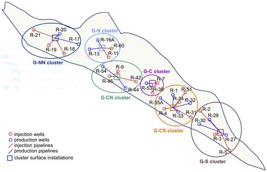 However, this result may suggest a possible improvement in the geothermal energy recovery system by a redistribution of both the wells among the clusters and the total production and injection stream distributions among the wells in each cluster. It should be noted that the practical optimization procedure for the geothermal energy recovery system would require including financial factors—a task to be performed in another study under preparation.