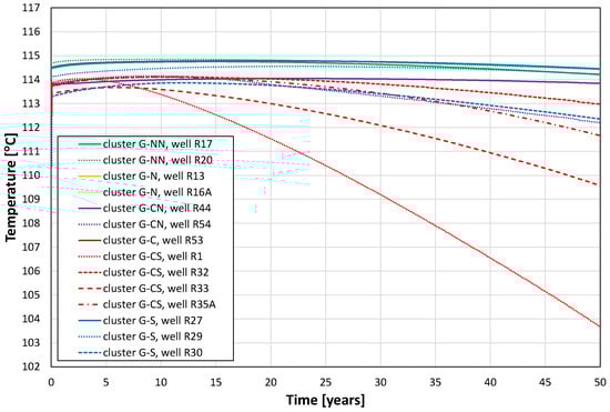 - final stage with a constant flow and composition of the produced fluid and a gradual decrease in the temperature of this fluid (for the remaining time of the 50-year forecast period, i.e., 13 years in the G-CN cluster up to 32 years in the G-NN cluster),