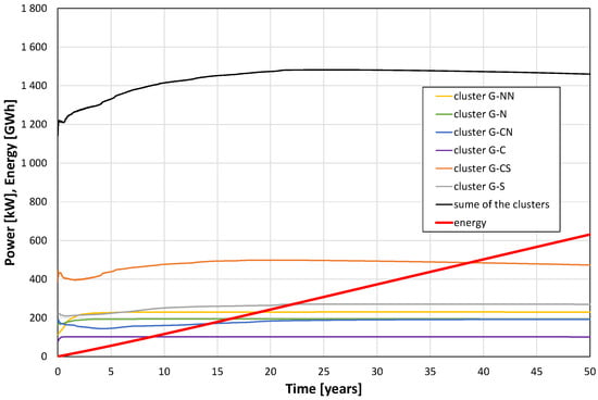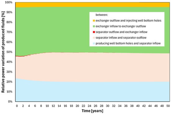 Other significant results of interest concern the variations of fluid power along the sequential elements of the geothermal energy recovery system. Their combined effects for all the wells and clusters are presented in Figure 12 as relative power variations vs. the duration of the recovery process. These results vary only slightly with time. They show the largest power reduction across the heat exchangers, which is a measure of energy recovery efficiency and amounts to 46.45% of the thermal energy produced from the reservoir.