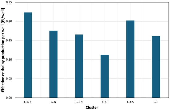 The distribution of the effective enthalpy production among all the six clusters of the geothermal energy recovery system, applied in the analyzed project, shown in Table 9, is quite non-uniform. While the effective enthalpy produced by CO2 is approximately proportional to the size of a cluster (in terms of the number of wells–see Table 4), as evident in the cases of clusters G-CS and G-S vs. cluster G-C, the effective enthalpies produced by the residual hydrocarbon gas and, in particular, by brine are not correlated with the cluster sizes but are rather specific to the cluster locations.