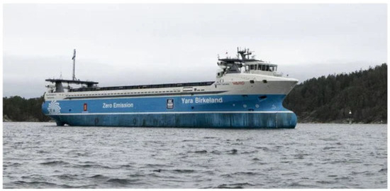 - Yara Birkeland, World’s 1st Fully-Electric Boxship, Prepares for Commercial Ops. Available online: https://www.offshore-energy.biz/yara-birkeland-worlds-1st-fully-electric-boxship-prepares-for-commercial-ops/ (accessed on 8 May 2024).