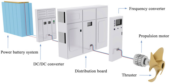 The ship’s electric propulsion system relies on batteries as the energy source, eliminating the traditional diesel engine propulsion system. This system comprises several key components, including a power battery system, a battery management system, a direct current (DC)–DC converter, a distribution board, an inverter, a propulsion motor, and a thruster, among others, as illustrated in Figure 2.