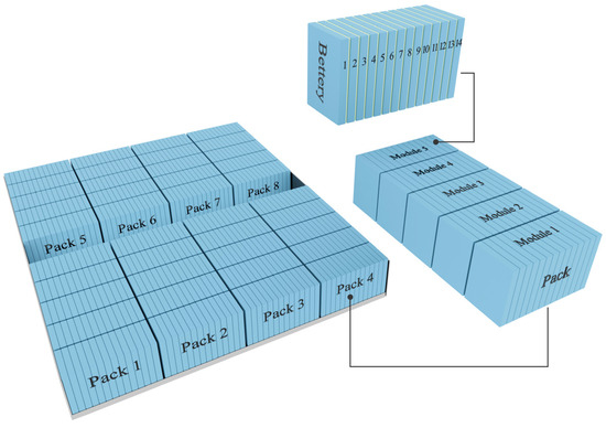 The battery module and pack specifications utilized in this study are as follows: each single-cell battery has a voltage of 3.2 V and a capacity of 10 Ah, with dimensions of 126 mm × 66 mm × 17 mm. The battery pack is composed of a total of 560 individual batteries, arranged into 8 battery packs, each containing 5 battery modules. These arrangements are illustrated in Figure 3.
