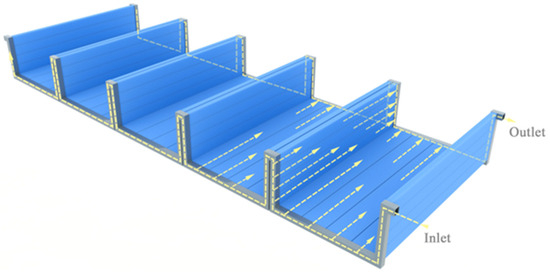 As depicted in Figure 4, in order to meet the dual requirements of lightweight and support strength of the flow plate, the flow plate is carefully composed of five independent units. These units are equipped with a manifold structure at both ends, which is designed to tightly connect them, forming a stable and complete flow plate structure. The interior of each splitter plate is carefully designed with a multi-channel structure, which not only ensures that the splitter plate has sufficient strength but also promotes uniform fluid flow to a certain extent, thereby significantly improving heat transfer consistency with the upper battery pack. For material selection, 3003 aluminum alloy was chosen due to its superior thermal conductivity, mechanical strength, and relatively low weight. The specific physical parameters of the alloy are as follows: density is 2720 kg/m3, specific heat capacity is 893 J/(kg·K), and thermal conductivity is 163 W/(m·K). These properties ensure efficient heat transfer in the liquid flow plate while maintaining structural stability and reliability.