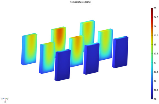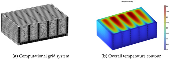 Figure 6a shows the computational grid systems. The pack has been meshed in all parts, each section is meshed differently. When designing the global grid size, the maximum grid size is 4.01 mm, and the minimum grid size is 0.722 mm. When designing the runner grid of the water-cooling plate, the maximum surface grid size of the inlet surface mesh is 1 mm, and the minimum surface mesh size is 0.5 mm. The battery is designed with a hexahedral structured grid with a maximum size of 4.02 mm and a minimum size of 0.0802 mm. A thermally conductive silicone gasket is designed with a hexahedral structured grid, with a maximum and minimum size of 0.2 mm. For the air and aluminum sheets, they are built to global dimensions. Figure 6b shows the overall temperature contour at discharge rate of 1C, a liquid fluid temperature of 20 °C, and a flow rate of 30 L/min.