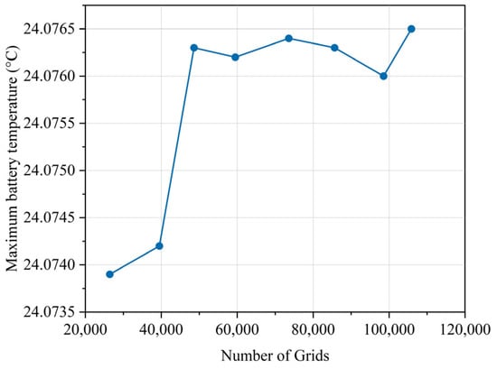 To verify the influence of meshing on the simulation results, a grid dependency test was carried out for different number of grids. A structured hexahedral mesh was used for the battery domains and a free prismatic mesh was used for cooling plate as shown in Figure 6a. When the number of grids exceeds 50,000, the maximum temperature value of the tested battery tends to be stable as shown in Figure 7. In this work, the number of grids is about 59,500.