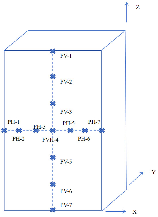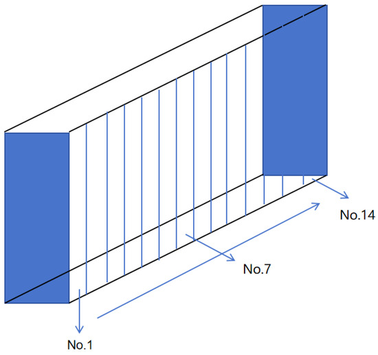 The basic operating conditions used in this article include the discharge rate of 1C, the liquid fluid temperature of 20 °C, and a flow rate of 30 L/min. In addition, the appropriate sampling points and batteries positioned at different locations were selected for testing. The configurations for the sampling points and battery numbers are illustrated in Figure 8 and Figure 9.