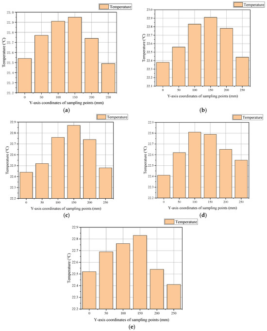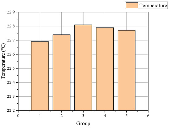 According to the surface center temperature data of each battery group, as shown in Figure 10, it can be observed that the temperature inside each battery group exhibits excellent uniformity. Specifically, battery group 1 has a temperature range of between 22.49 °C and 22.95 °C, resulting in a temperature difference of only 0.46 °C. Similarly, the temperature fluctuation within battery group 2 is between 22.38 °C and 22.91 °C, with a temperature difference of 0.53 °C. Battery groups 3 and 4 also demonstrate consistent temperature distributions, with battery group 3 showing a temperature range from 22.44 °C to 22.87 °C, and battery group 4 ranging from 22.41 °C to 22.81 °C, both having a temperature difference of 0.4 °C. Finally, battery group 5 exhibits a temperature range from 22.41 °C to 22.83 °C, with a temperature difference of 0.42 °C. These data indicate that the temperature deviation within each battery group is minimal, leading to the conclusion that the surface center temperature within each battery group is highly consistent. The temperature at the center point of each battery group is utilized to evaluate the consistency of battery surface temperatures across different battery groups. As illustrated in Figure 11, the temperature differences at the center points of batteries among various groups are relatively minor. Thus, it can be concluded that employing parallel-flow liquid cooling plates effectively maintains consistent battery temperatures across the pack.