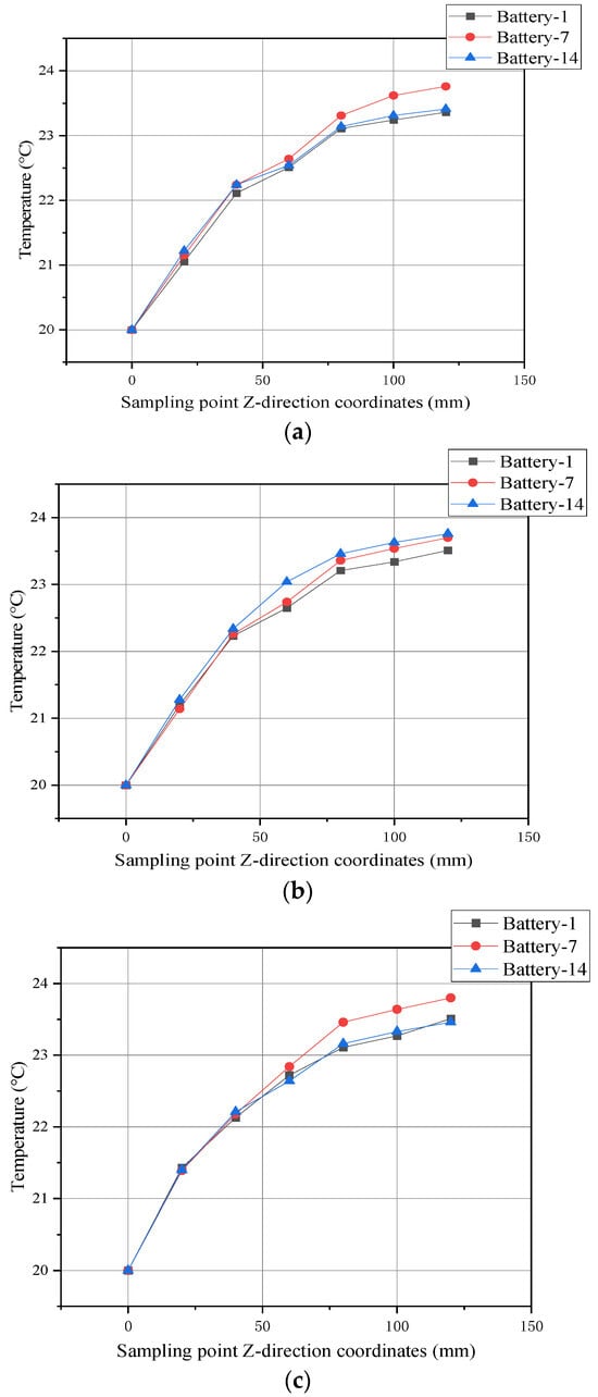 The overall temperature characteristics of the battery pack are evaluated by measuring the temperature at the center point of the battery surface within the pack. The battery pack comprises five modules, and each module contains 14 battery cells. As depicted in Figure 9, the temperatures are recorded at the center points of the two measuring surfaces of batteries No. 1, No. 7, and No. 14. Additionally, the temperatures at the center points on both sides of each battery are analyzed to assess the consistency of the temperature across the battery group, as illustrated in Figure 10.