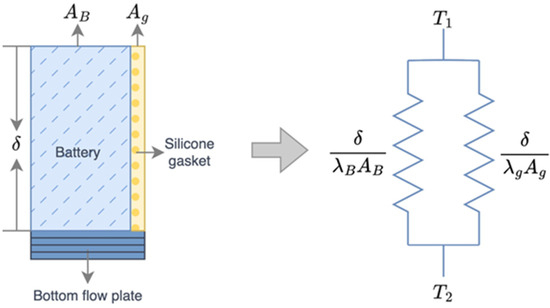 The thermal conductivity of the battery and the silicone gasket belongs to the parallel thermal conductivity form as shown in Figure 14. Therefore, the total thermal resistance of the two is equal to the reciprocal of the sum of the battery thermal resistance and the silicone gasket thermal resistance . Thus, the expression for the total thermal conductivity and resistance is as follows: