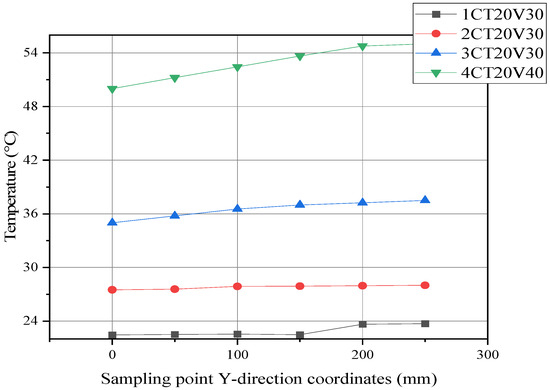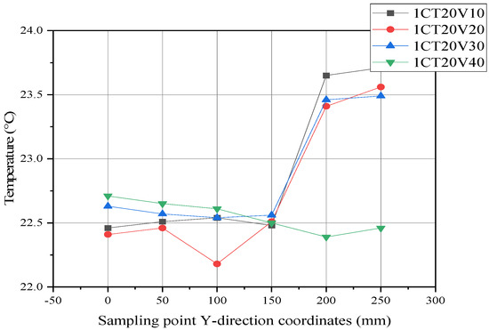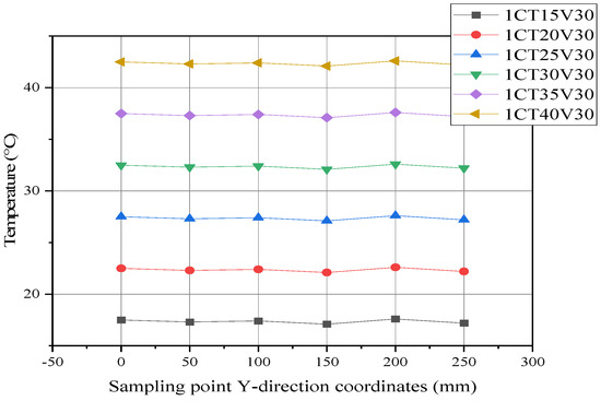 The focus is on how liquid flow rate and temperature affect the heat transfer efficiency of the battery pack, with a special emphasis on maintaining temperature consistency and uniformity across battery groups. Under the basic operating conditions, the liquid flow rate varied at 10 L/min, 20 L/min, 30 L/min, and 40 L/min, while the liquid temperature was assessed at 15 °C, 20 °C, 25 °C, 30°C, 35 °C, and 40 °C. The temperature data from the center points on both sides of the battery surface in battery group 3 were analyzed, as shown in Figure 15. In Figure 15, “1CT20V10” denotes the conditions of a 1C discharge rate, 20 °C temperature, and 10 L/min flow rate. The results indicate that the temperature at the center point of the battery surface exhibits strong consistency, with fluctuations remaining within 1 °C. Variations in the liquid flow rate have a relatively minor effect on the temperature consistency between batteries, with no significant fluctuations observed as flow rate changes. Consequently, changes in the flow rate have a minimal impact on battery temperature.