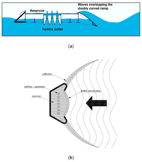 Illustration of Wave Dragon converter. From top to bottom: (a) side view and (b) top view.